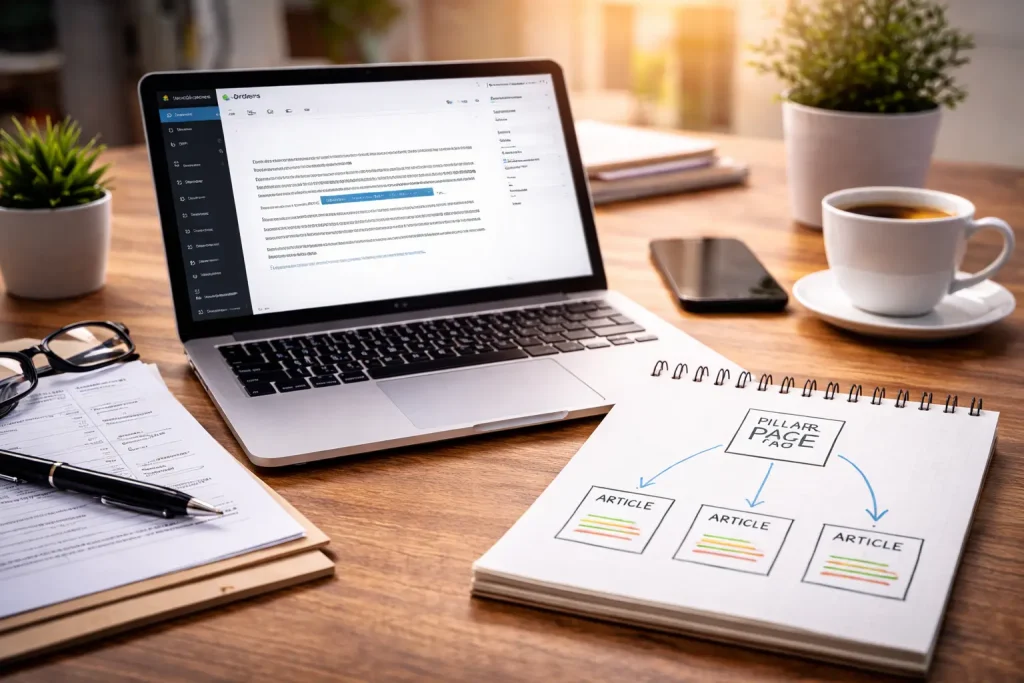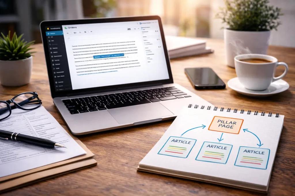Najprostszy model, który działa praktycznie na każdej stronie, to układ „filar → wsparcie”. Filar to jedna mocna podstrona na szeroki temat (np. „SEO”, „strony WordPress”, „Meta Ads”, „katalog usług”), a artykuły wspierające to krótsze, węższe teksty, które odpowiadają na konkretne pytania. Linkowanie robi się wtedy naturalnie. Artykuły wspierające linkują do filaru (bo filar ma być „główną stroną” tematu), a filar linkuje w dół do najważniejszych tekstów wspierających (żeby ktoś mógł zejść głębiej). Do tego można dorzucić linki „pomiędzy” artykułami wspierającymi, ale tylko tam, gdzie to naprawdę pomaga czytelnikowi. To jest porządek, który Google rozumie od razu, a użytkownik ma wrażenie, że strona jest poukładana, a nie że każdy wpis żyje sobie samotnie.