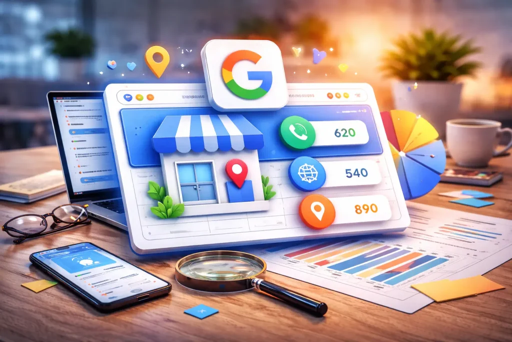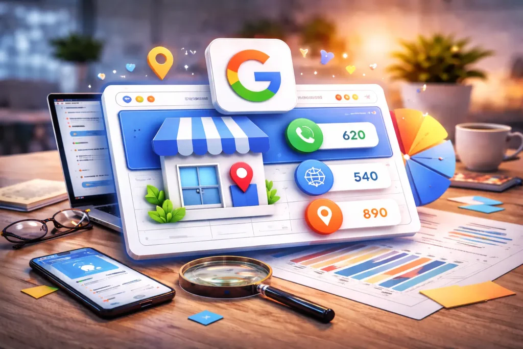 Najprostszy układ jest taki: wizytówka ma łapać uwagę i pchać ludzi do kolejnego kroku, a strona ma ten krok domknąć. W praktyce oznacza to, że jeśli w Profilu Firmy Google dużo osób klika w stronę, to po wejściu muszą od razu zobaczyć to, czego szukali: usługę, kontakt, ofertę, formularz albo jasne CTA. Sama wizytówka nie załatwi wszystkiego. Google pokazuje metryki takie jak website clicks, calls i directions właśnie po to, żeby dało się ocenić, jak profil wspiera dalszą ścieżkę użytkownika.