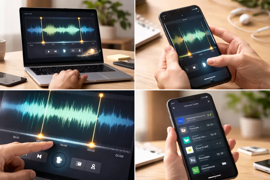 To rozwiązanie dobrze sprawdza się wtedy, gdy chcesz przygotować krótki klip audio, prosty materiał do publikacji albo własny dzwonek. Narzędzie jest opisane jako darmowe, w pełni online i nastawione właśnie na szybkie cięcie plików bez dodatkowego oprogramowania. Gotowy plik możesz pobrać albo przejść dalej do kolejnej edycji.