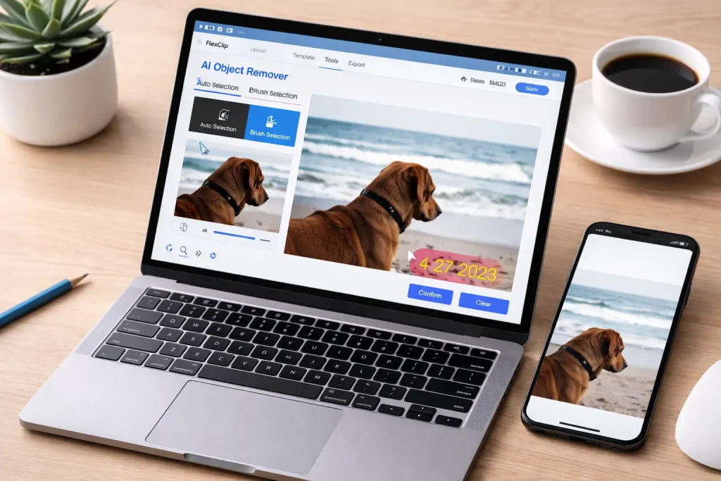 W narzędziu FlexClip masz to rozwiązane bardzo prosto. Możesz spróbować automatycznego wyboru (kliknięcie obiektu), a jeśli AI nie “złapie” dobrze, przechodzisz na pędzel i malujesz po tym, co chcesz wyciąć. Klucz jest taki, żeby nie zaznaczać “na styk”. Zostaw minimalny margines dookoła napisu/daty/śmiecia, bo wtedy AI ma większą szansę domalować tło bez zostawiania konturu.
