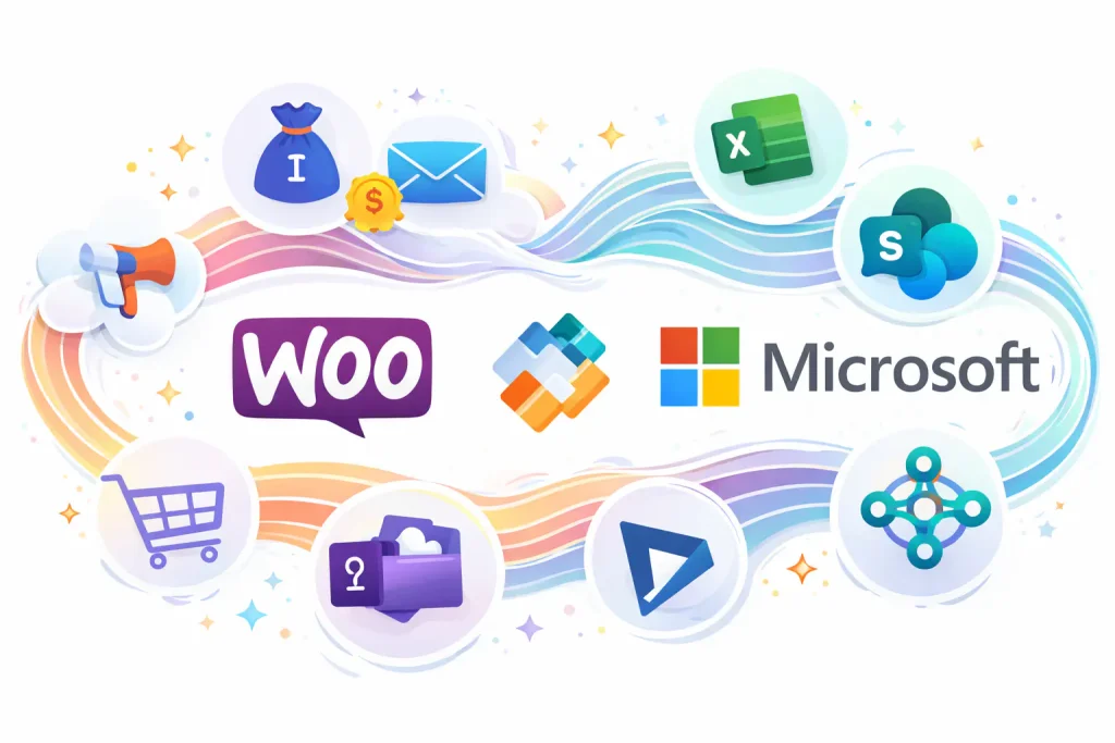 WooCommerce Microsoft to w praktyce połączenie sklepu WooCommerce z ekosystemem Microsoft przez Power Automate. Taka integracja pozwala spinać sklep z ponad 1 000 usługami dostępnymi w Power Automate, w tym z Teams, Excel, SharePoint, Dynamics 365 czy Business Central. Dzięki temu sklep nie działa już osobno, tylko może wejść w większe procesy w firmie.